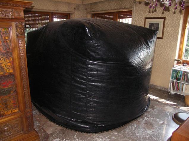 d) Tratamiento con gases inertes: Se realiza introduciendo el objeto a tratar en una burbuja de hecha con un plástico especial y cerrada herméticamente. En esta burbuja, se sustituye el oxígeno del aire por un gas inerte como el argón o el nitrógeno. Una vez conseguida la ausencia de oxígeno hay que mantener estas condiciones durante un determinado periodo de días, que depende fundamentalmente del gas utilizado y de la temperatura a la que se realiza el tratamiento,eliminándose también las larvas y huevos si se respetan las condiciones indicadas para el tratamiento. Es un tratamiento de gran aplicación para el tratamiento de obras de arte y mobiliario, ya que no afecta a ningún tipo de acabado decorativo, como dorados, pigmentos, etc.