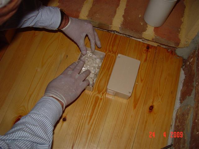 a) Inyección: Este sistema consiste en la creación de una barrera insecticida de alto poder residual en el subsuelo o en los marcos de las puertas de la instalación a proteger. Para crear dicha barrera, se procede a realizar una serie de taladros en todo el perímetro del marco retirando previamente el tapajuntas, realizando una perforación cada 20 cms, a lo largo del bastidor, colocando una válvula de no retorno e inyectando el producto insecticida al interior produciendo unas bolsas de producto que protegen al elemento de madera y que se garantiza por 5 años.